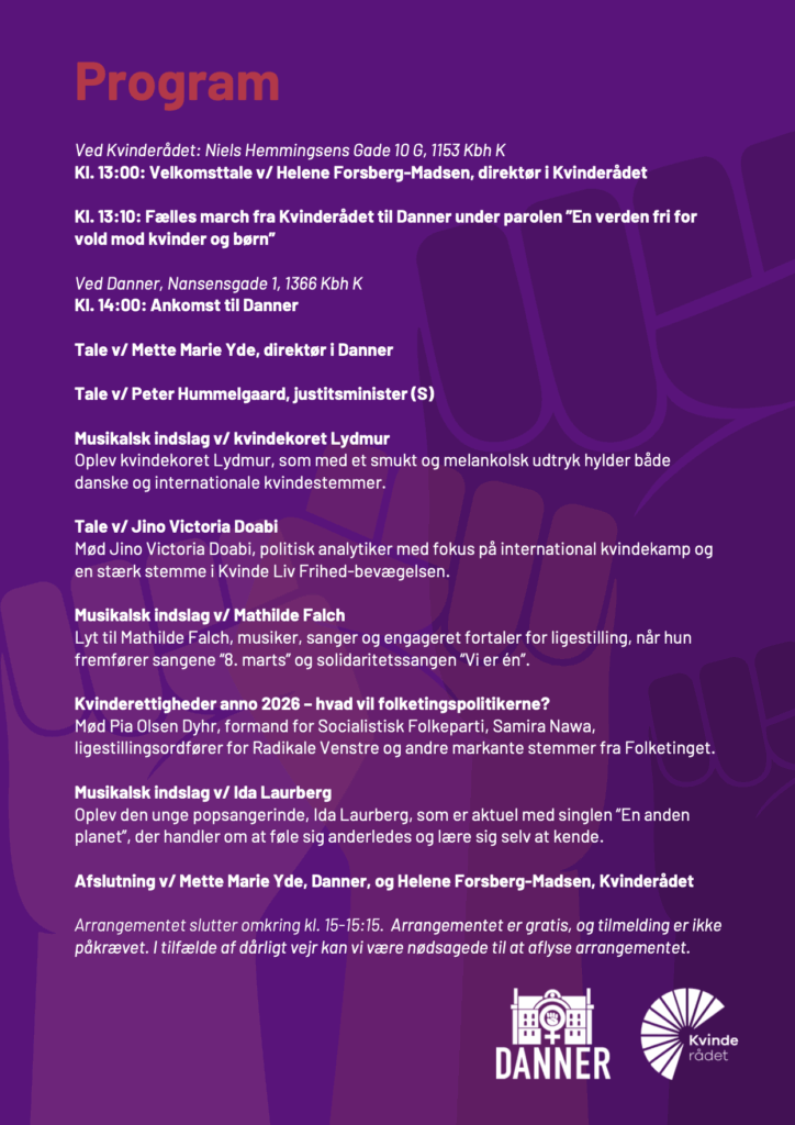 Kom med når Danner og Kvinderådet igen i år slår sig sammen for at fejre 8. marts. Vi kan løfte sløret for, at dagen byder på march igennem København, taler fra politiske aktører og musikalske indslag fra Ida Laurberg, Mathilde Falch og kvindekoret Lydmur.